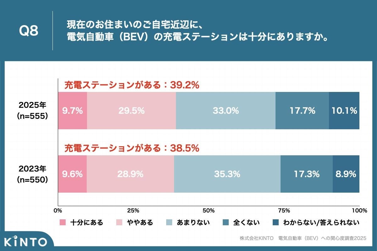 「Q8. 現在のお住まいのご自宅近辺に、電気自動車(BEV)の充電ステーションは十分にありますか。」(n=555)と質問したところ、「十分にある」が9.7%、「ややある」が29.5%という回答となりました。