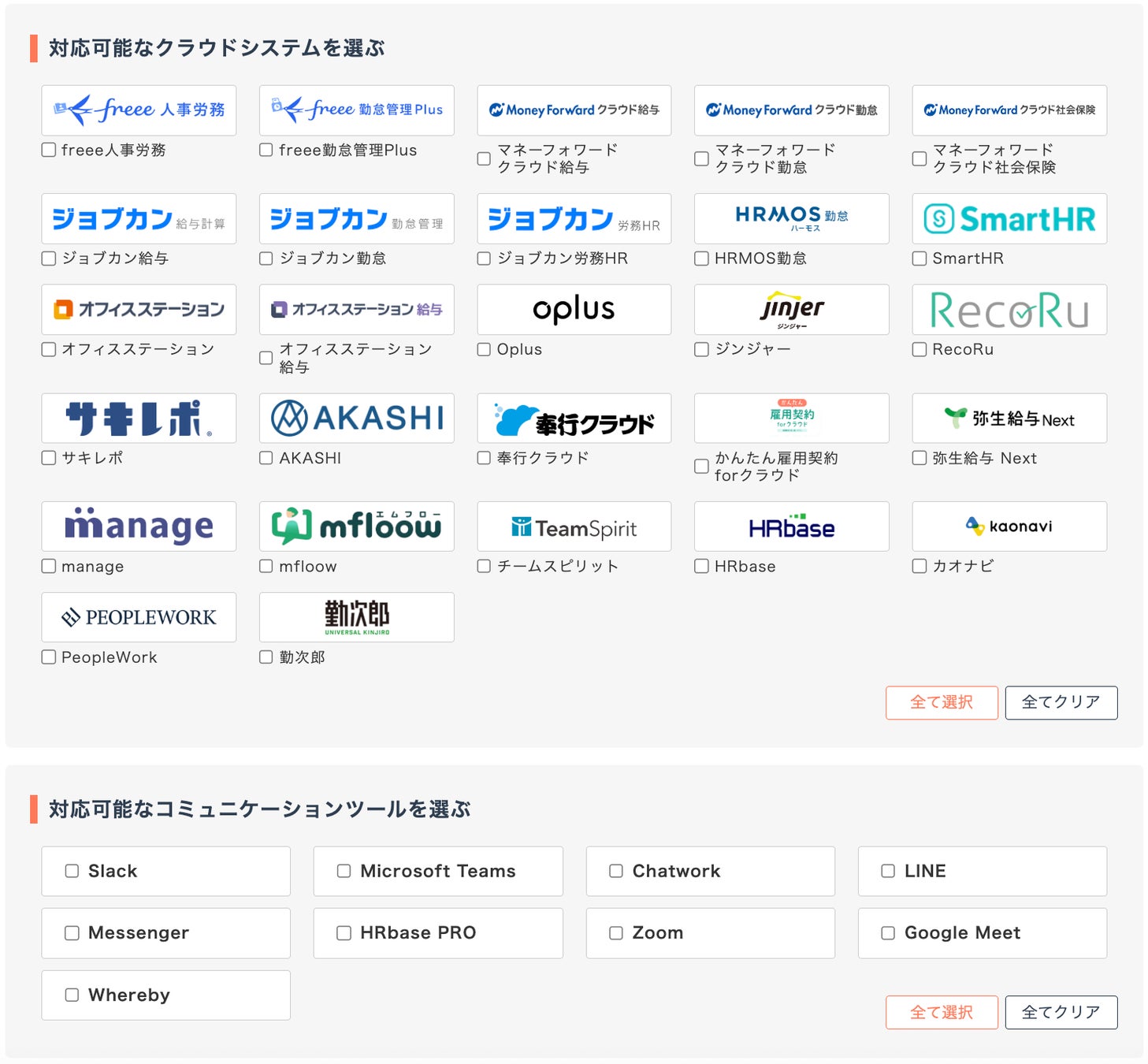 対応可能なクラウドサービスやコミュニケーションツール(Chatwork・Slackなど)で絞り込み検索ができ、企業とのマッチングや提携先の開拓にもご活用いただけます。