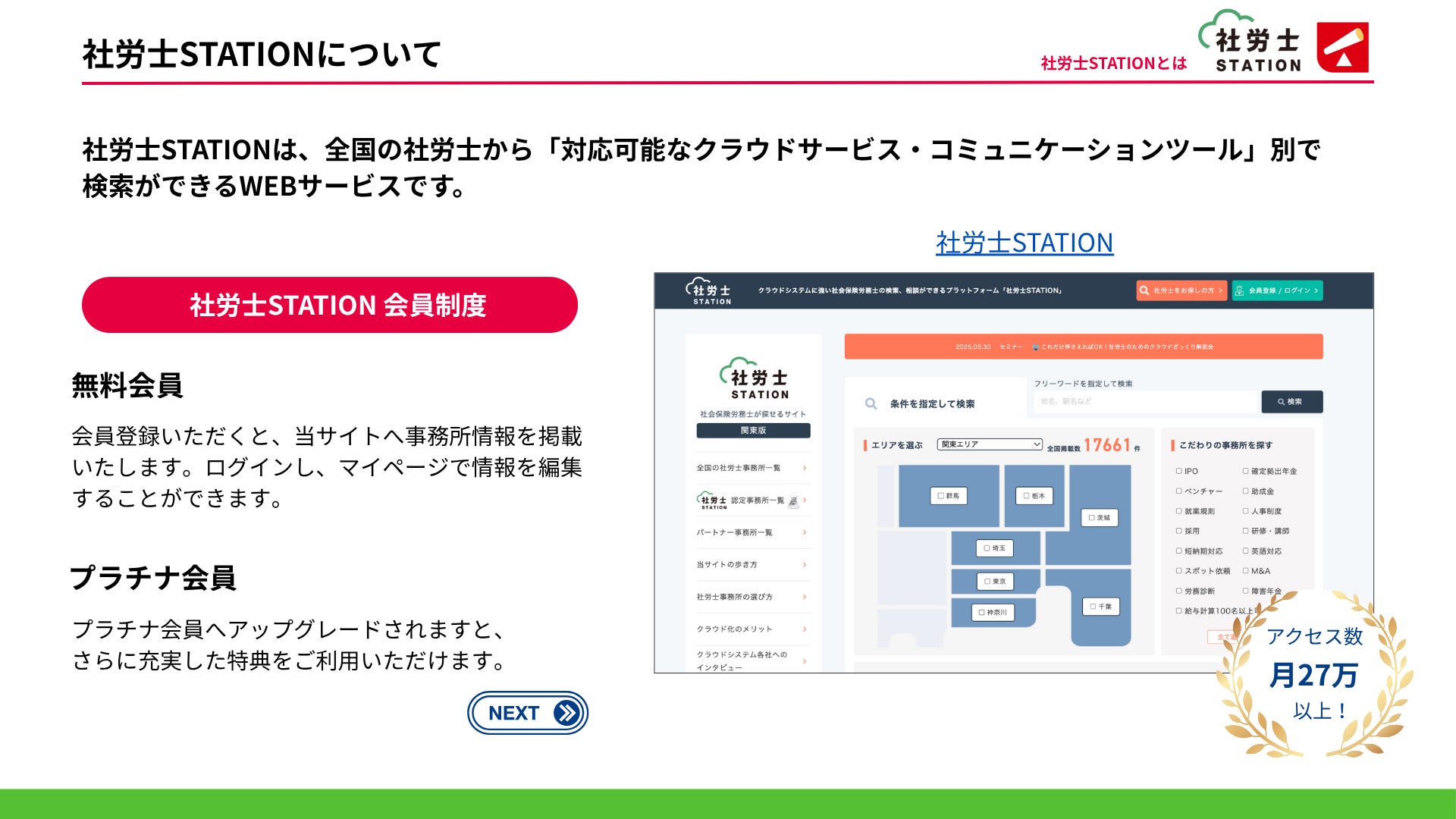 また、社労士STATIONは、全国の社労士を「対応可能なクラウドサービス」「対応可能なコミュニケーションツール」ごとに検索できるWEBプラットフォームとしても進化を続けており、企業とのマッチングや広報活動の強力な基盤としてご活用いただけます。