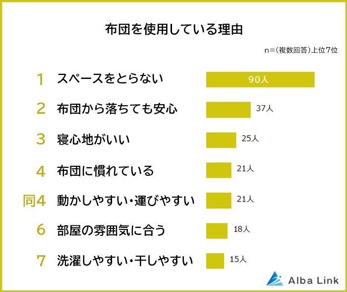 布団を使用している理由とてし最も多かった回答は「スペースをとらない」でした。布団は畳んで収納できるので、寝る時間以外は部屋を広く使いたい人にとっては嬉しいですね。また高さがないため、お子さんを寝かせておく際に安心できるという人も目立ちました。