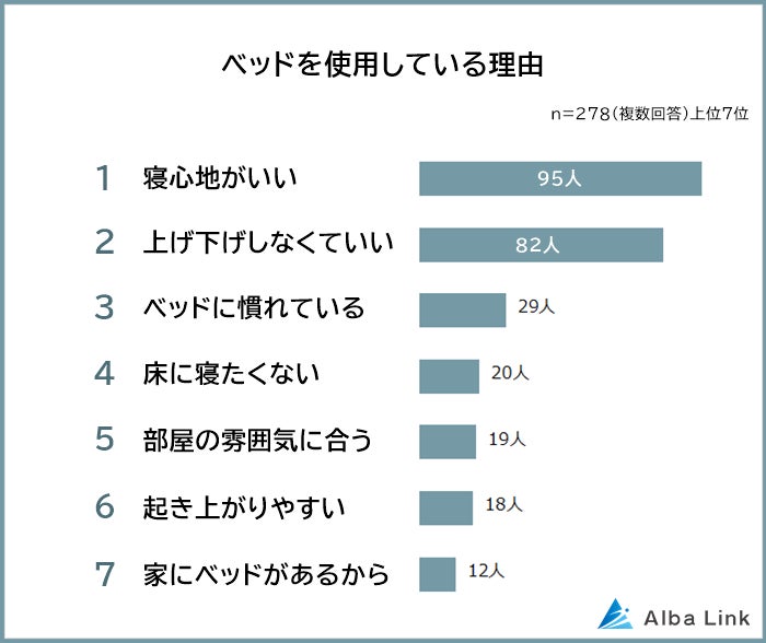 ベッドを使用している理由で最も多かったのは「寝心地がいい(95人)」でした。ベッドだと好みの硬さや弾力のマットレスを選びやすいため、寝心地がいいと感じる人が多いのでしょう。