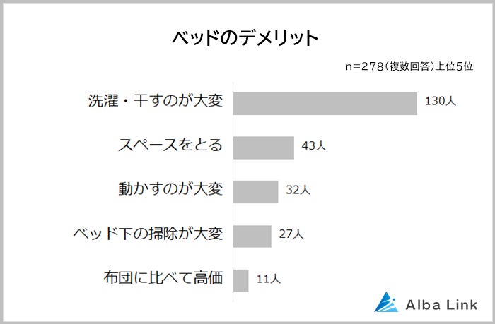 「手入れが手間」「スペースをとる」「動かすのが大変」など、ベッドの大きさに由来するデメリットが多くランクインしています。
