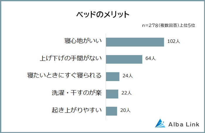 ベッドを使用している278人に「ベッドのメリット」を聞いたところ、1位は「寝心地がいい(102人)」でした。ベッド派の人がベッドを選んだ理由と同じですね。