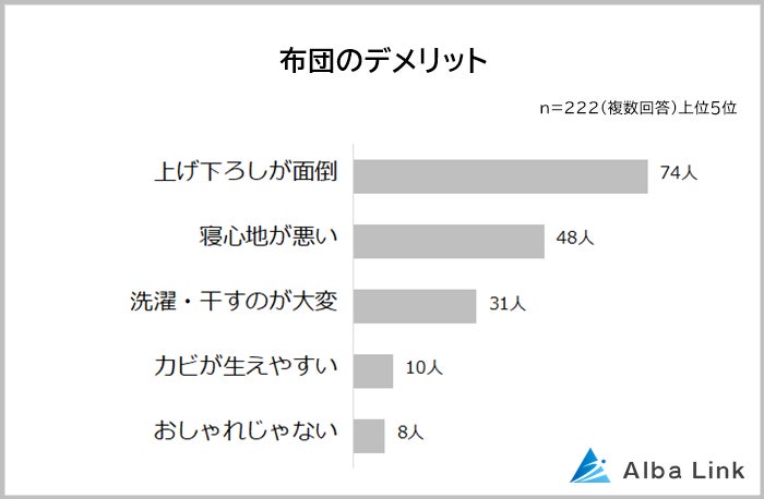 株式会社AlbaLink(本社:東京都江東区、代表取締役:河田 憲二)は、全国の男女500人を対象に「ベッドと布団に関する意識調査」を実施し、そのデータをランキングにしました。