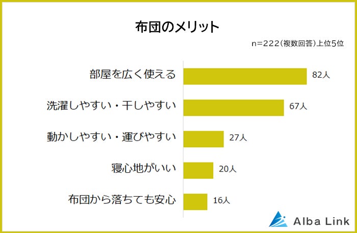 続いて、布団を使用している222人に「布団のメリット」を聞きました。その結果、1位は「部屋を広く使える(82人)」、2位は「洗濯しやすい・干しやすい(67人)」でした。