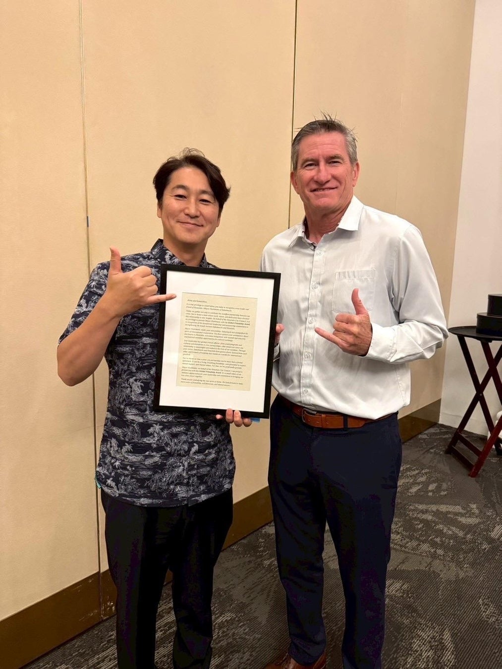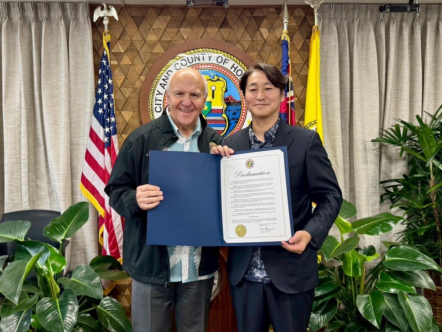 「境町とホノルル市のパートナーシップを大きく前進させ、文化交流や青少年プログラムを通じて両市町の絆を深めてくれました。町長の温かいおもてなしと誠実な協力姿勢は、姉妹都市関係を協定だけでなく、生きた友情へと発展させました。その素晴らしいリーダーシップと献身に敬意を表します。」