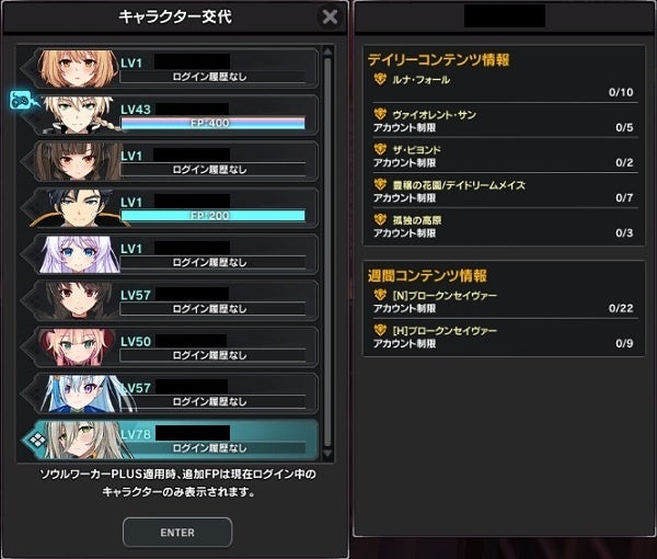 また、キャラクターを選択することでデイリー/週間コンテンツの入場回数を確認する事ができ、キャラクター選択後にウィンドウ下部の「ENTER」ボタンをクリックもしくはキャラクターをダブルクリックすることでキャラクター選択画面へと戻らずにキャラクターの変更が可能です。