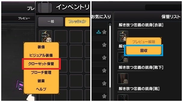 また、リストに保管したコスチュームはアイコンを右クリックし表示されるメニューから「回収」を選択すると、該当のコスチュームをアイテムの状態へと戻すことが可能です。