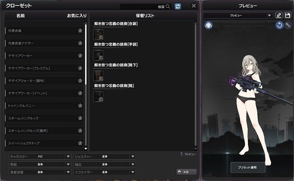 また、クローゼットウィンドウ右側のプレビューウィンドウではウィンドウ上部のプルダウンからプリセットスロットを選択することで最大20通りのコスチュームプリセットを保存することが可能です。