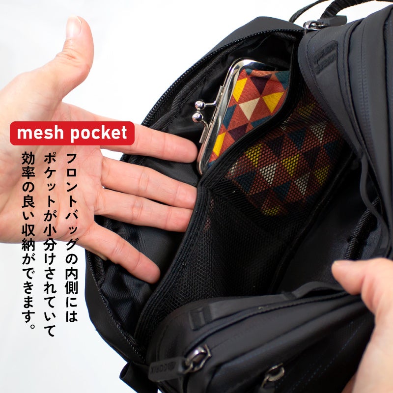 フロントバッグの内側にはポケットが小分けされていて効率の良い収納ができます。