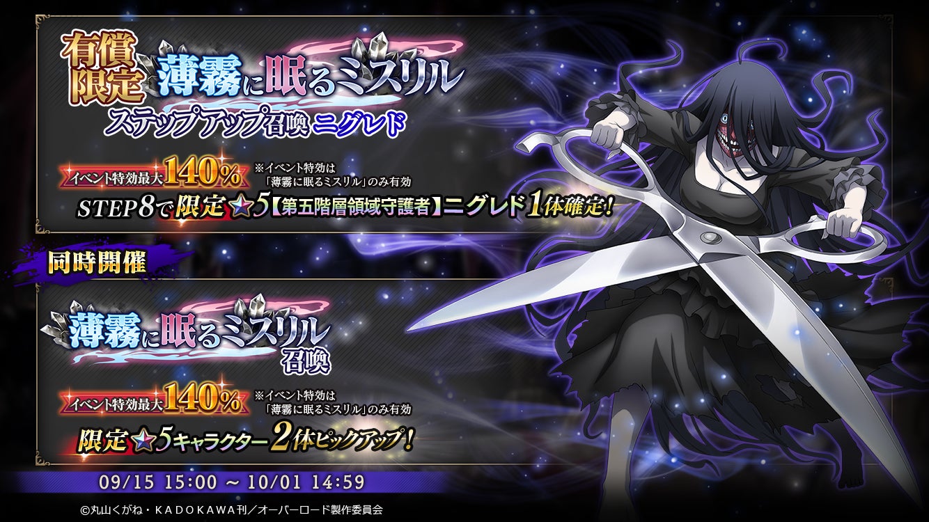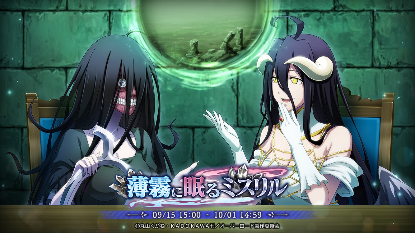 9/15よりイベント『薄霧に眠るミスリル』を開催いたします!イベント連動召喚では『★5【麗裳衣の白亜】アルベド』『★5【第五階層領域守護者】ニグレド』が新登場!有償限定召喚の他、無償混沌石でもご利用いただけるピックアップ召喚も同時開催!