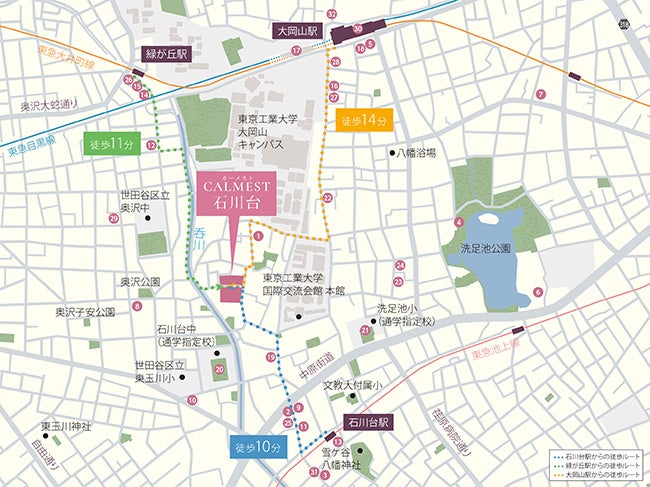 東急池上線「石川台」駅:徒歩9分、東急大井町線「緑が丘」駅:徒歩11分、 東急目黒線・大井町線「大岡山」駅:徒歩14分 |