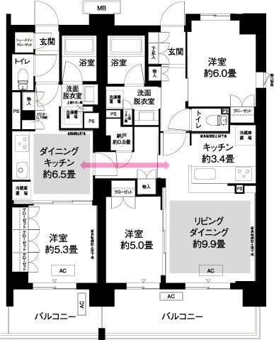 三世代同居を目的とした、ファミリー世帯向けの専有面積94.09㎡の間取り(2LDK+1DK)プランを2戸採用し、2LDK部分と1DK部分で玄関やキッチン、トイレ、浴室等の水回りの設備を独立させています。また、2つの空間を連絡通路でつなげることで多様なライフスタイルに合わせられるよう工夫をしています。