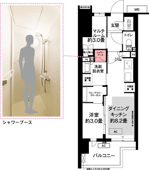当住宅では、単身世帯向け1DKの一部において浴室をシャワーブースとし、個々のライフスタイルに合わせて収納やテレワーク等に活用が可能なマルチスペース等を備えた間取りプランを採用しました。