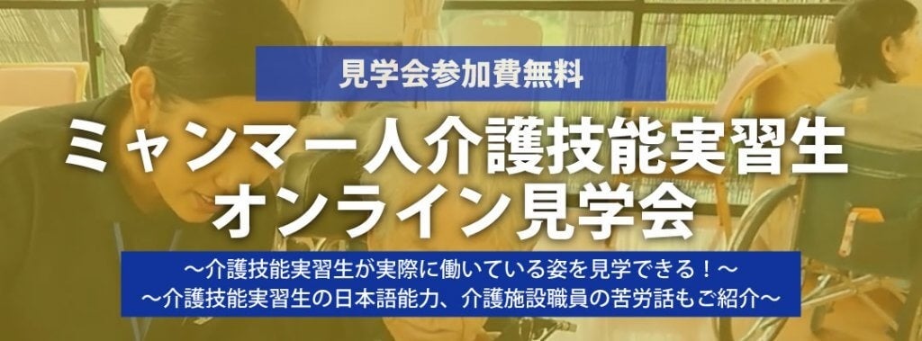 ミャンマー人の介護技能実習生が実際に働いている姿を見学することができるオンライン見学会を開催いたします。