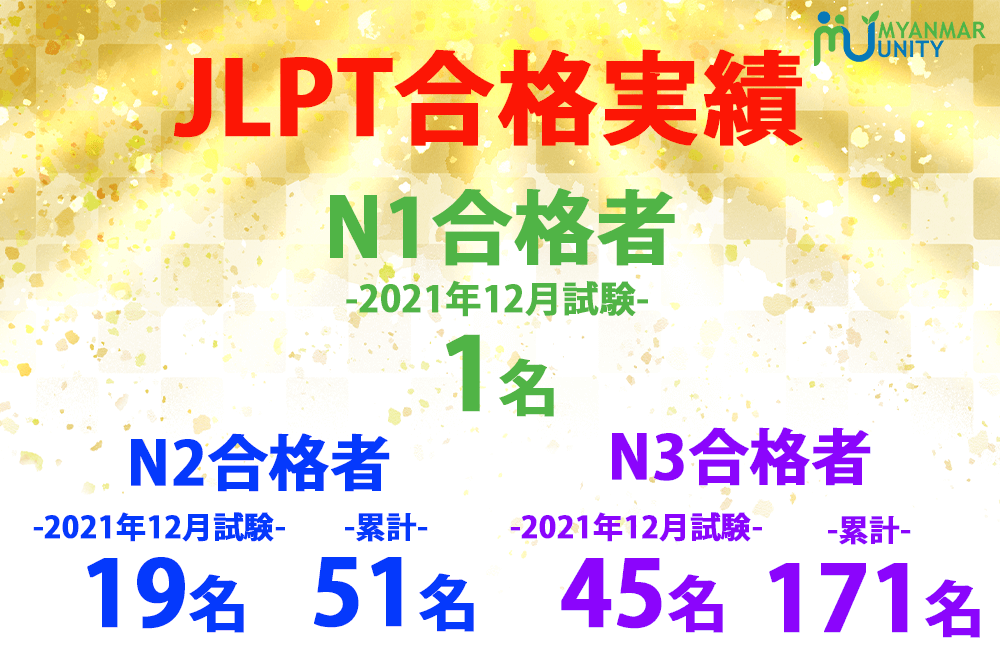 ミャンマーNo.1人材送り出し機関「ミャンマー・ユニティ」の技能実習生が2021年12月の日本語能力試験(JLPT)で初めてN1合格者が誕生しました。
