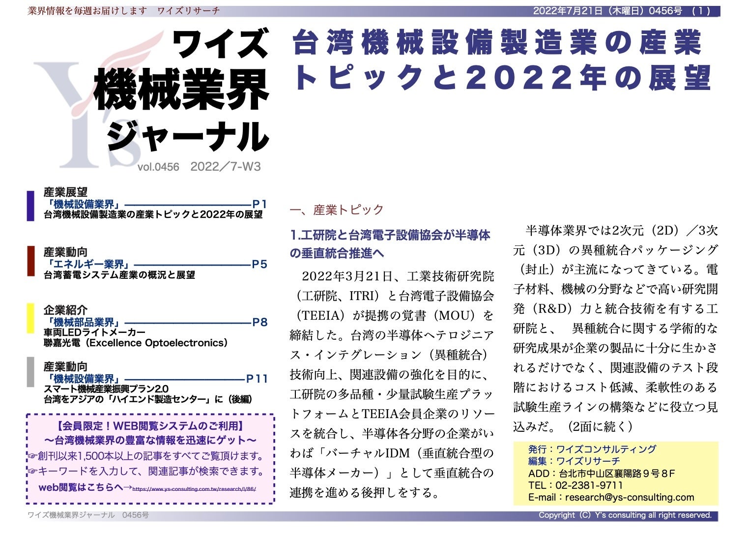 ワイズコンサルティング グループ(本社:中華民国台北市、代表取締役:吉本康志)は台湾機械業界専門誌「ワイズ機械業界ジャーナル」の2022年7月第3週号を発行しました。今週号では、機械設備業界、エネルギー業界、車両LEDライトメーカーの聯嘉光電(Excellence Optoelectronics) 、機械設備業界の動向をご紹介します。