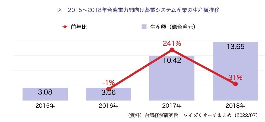 台湾の蓄電システム・部品メーカーは、2018年までは日本や欧米を主なターゲット市場とし、家庭・工業・商業用の小型蓄電システム・部品を主力製品としていた。台湾では市場が十分に成熟していないことなどから、蓄電システムは試験運用の段階にとどまっていたのだ。海外での蓄電システム市場拡大に伴い、台湾電力網向け蓄電システム産業の18年の生産額は13億6500万元と前年比で小幅増加した。