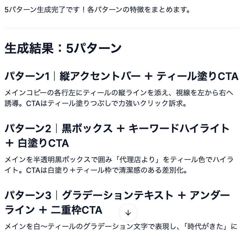 生成された5パターンはそのままABテストの入稿素材として活用できます。テキスト変更のみでなく、ボタンの配色・形状・サイズの調整も含めた総合的なCTA改善が一操作で完結します。