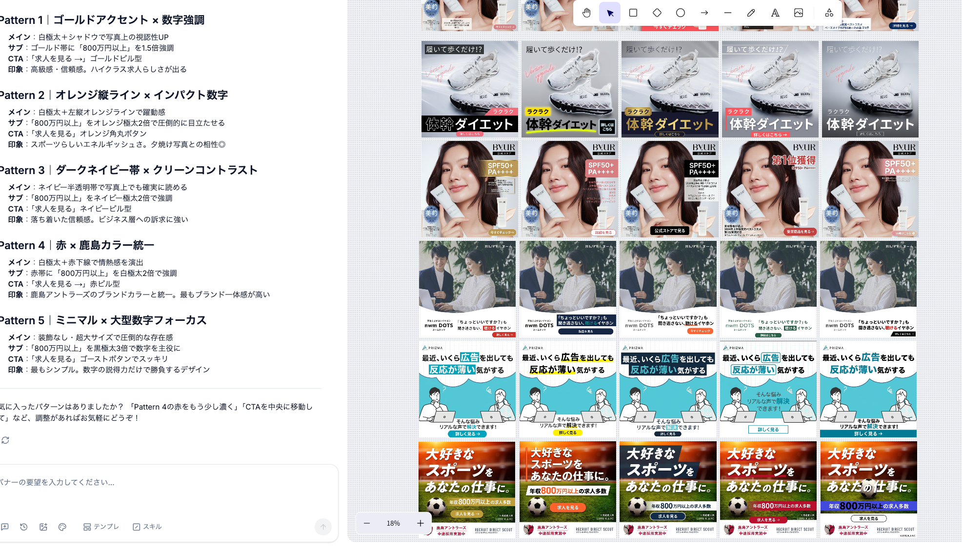 広告バナーのクリック率(CTR)改善において、コピー表現とCTAボタンの設計は直接的な影響因子です。しかし「どのコピーが刺さるか」「CTAの文言・色・形状をどう変えるか」を検証するには、複数の改善案を制作してABテストを回す工数が必要になります。