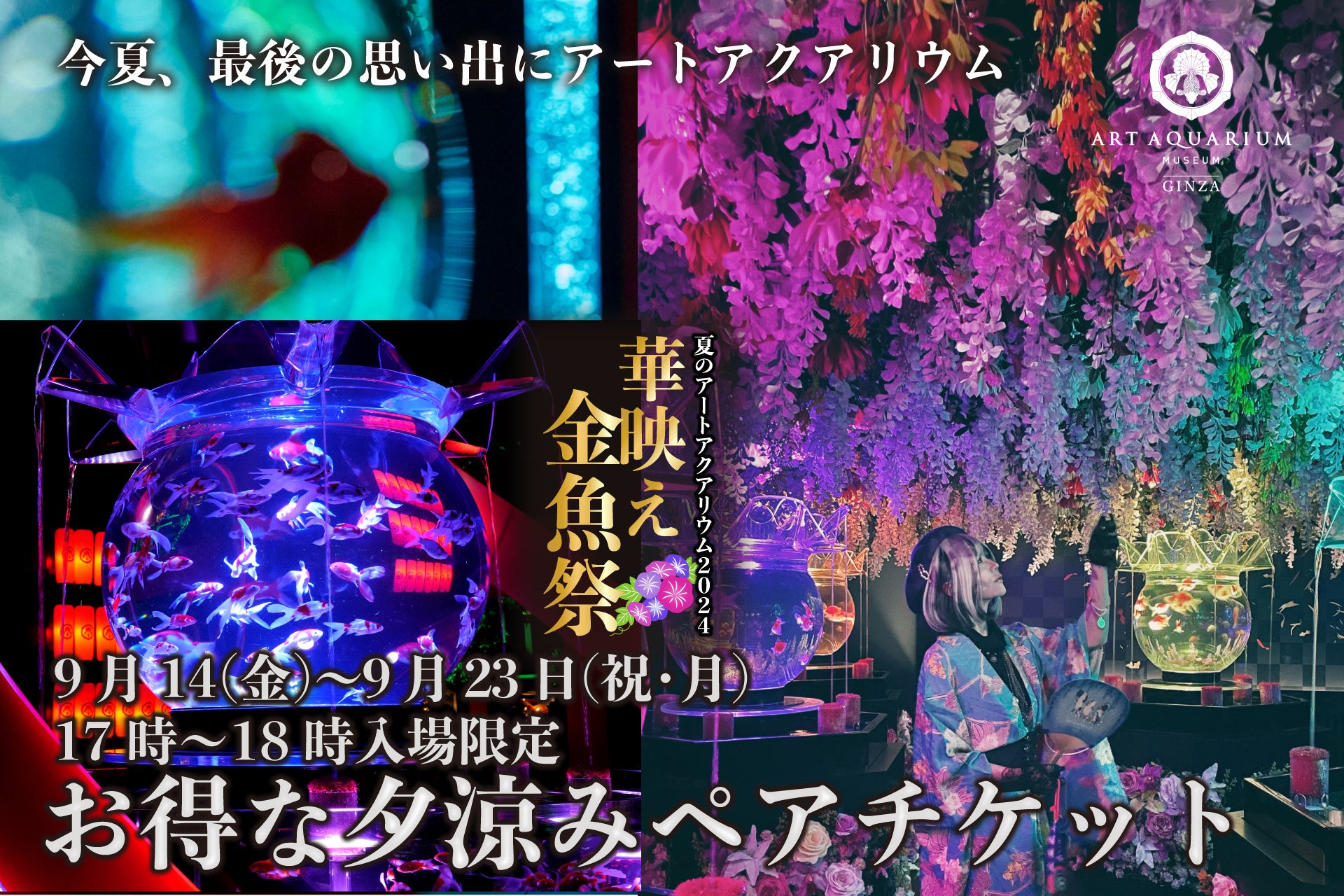 暑い日がまだまだ続く9月。アートアクアリウム美術館の館内も9月25日までは夏の風情感じる涼やかな空間で皆様をお迎えします。今年の夏を最後まで満喫していただきたいと思いお得なチケットをご用意いたしました。夏の風物詩“金魚”に癒され、涼む、いまこそ楽しみたいおでかけのラストチャンスです。