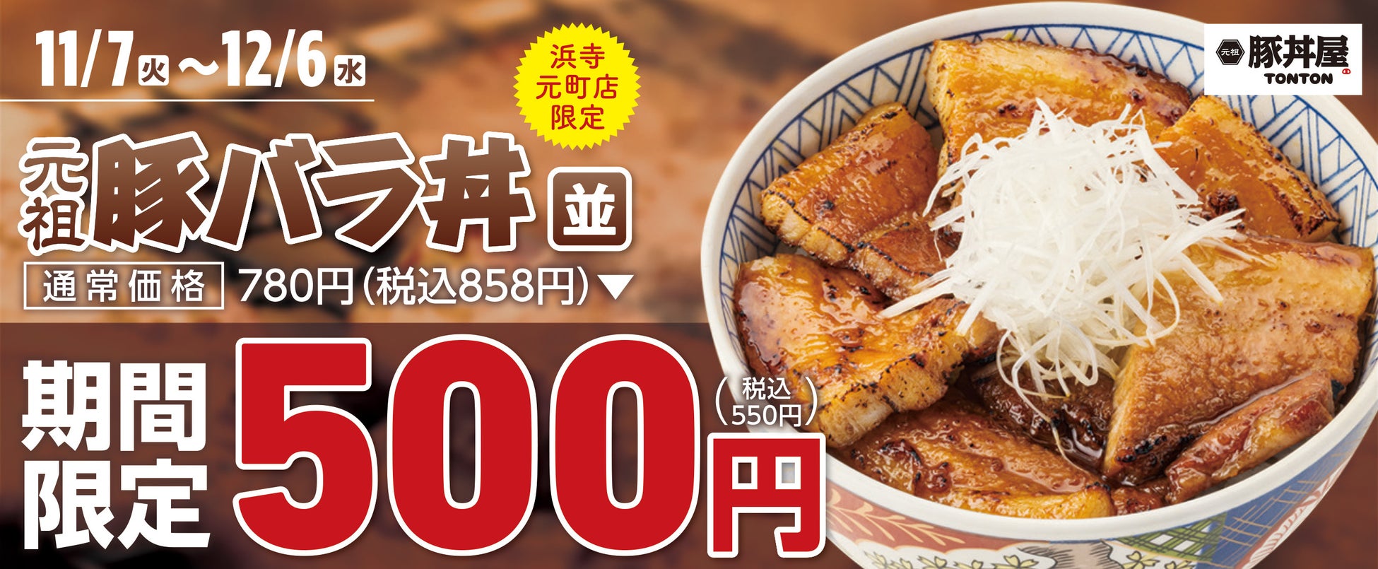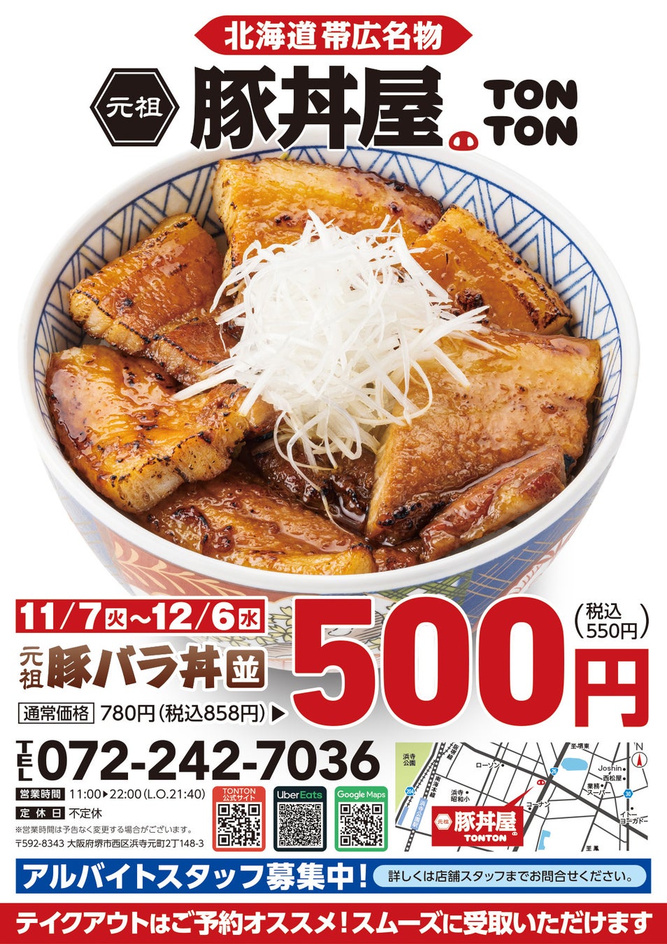 ボリュームたっぷりの北海道・帯広豚丼が人気の「元祖豚丼屋TONTON 浜寺元町店」(住所:大阪府堺市西区浜寺元町2丁148-3、TEL:072-242-7036)で、11月7日(火)〜12月6日(水)の期間中、「豚バラ丼【並】」を期間限定価格500円(税込550円)で提供いたします。