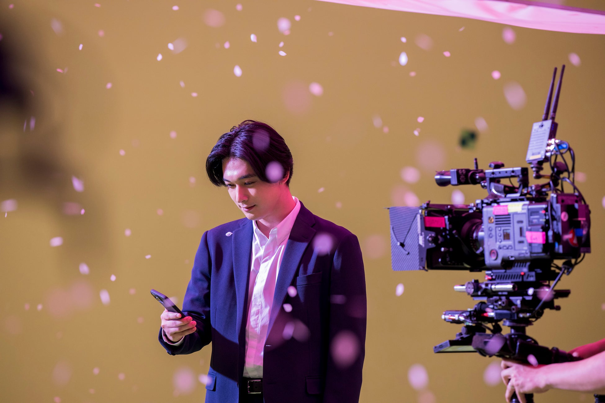 【必ずハッピーエンド】篇の撮影では、激しい動きはなく、全体的に吉沢さんの表情にフォーカスを当てた撮影となりました。特に、桜の花びらが舞う中、将来に向けて歩き出す夫婦に向けて発した「幸せに」とつぶやくシーンでは、クローズアップされた切なくも甘い吉沢さんの表情に、その撮影をモニター越しで見ていたスタッフ全員が魅了され、現場が甘い空気に包まれました。さらに、このシーンをモニターでチェックしていた吉沢さんは、桜が散りゆく様子にうっとりしながら、「綺麗だな…」と一言。自身の表情を確認していたのではなく、桜に注目していた吉沢さんに対し、監督もクスッと笑っていました。この【必ずハッピーエンド】篇の撮影では、吉沢さんの表現の豊かさとカメラワークの出来が見事に重なり合い、OKテイクが連発しました。