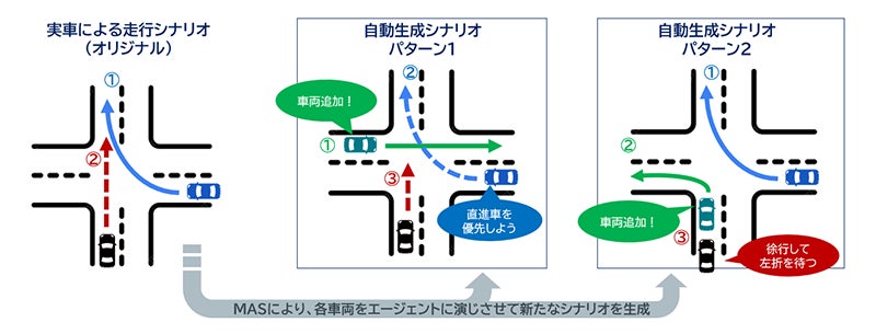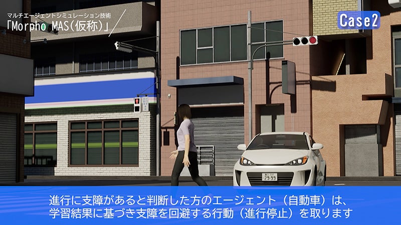 ※「Morpho MAS」:モルフォが先行開発中のマルチエージェントシミュレーション(複数の自律的なエージェントの行動が相互に影響し合うことで、系全体の複雑な現象を再現するシミュレーション)技術です。Morpho MASを用いることで、自動車シミュレータ内の人物や車両などのエージェントに実環境の挙動を学習したAIを搭載し、リアリティのある走行シナリオを自動生成することが可能となります。