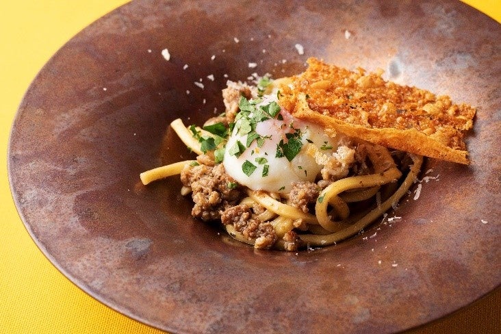 「味ぽん」を練り込んだ生パスタを使用。パスタソース、上に添えた温玉やクロカンテにも「味ぽん」を使用しました。「味ぽん」の存在を強く感じることができるメニューながら、肉感たっぷりのラグーソースと合わせることで一体感のある絶妙なバランスに仕上げた一品です。