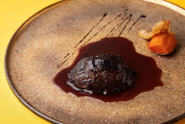「味ぽん」と赤ワインソースで牛頬肉を煮込みました。「味ぽん」とフランボワーズを使用したグレモラータソースで味が変わるのも面白い一品です。