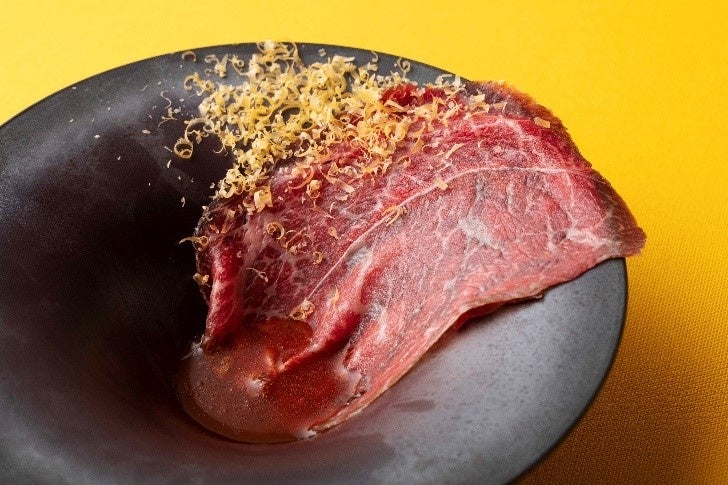 自家製ブレザオラ(牛肉の生ハム)に、とろっと濃厚な「味ぽん」卵黄ソースを絡めてお召し上がりいただく、新感覚の冷製すき焼きです。