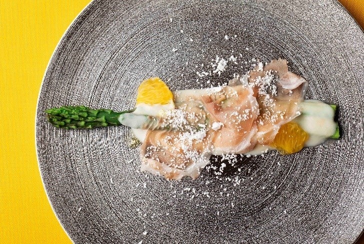 北海道の長谷川さんが育てたアスパラガスの芯の部分と汲み上げ湯葉を使用したソースに「味ぽん」を隠し味として使用することで、味の下支えをしている一品です。