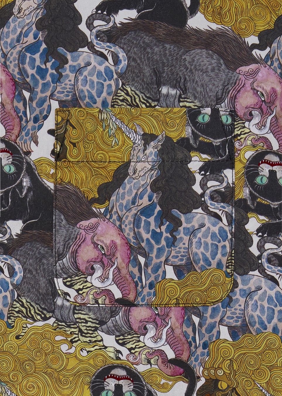 獏、一角獣、獅子炎、笑笑猫がギュッと詰まった大迫力のパターン柄。