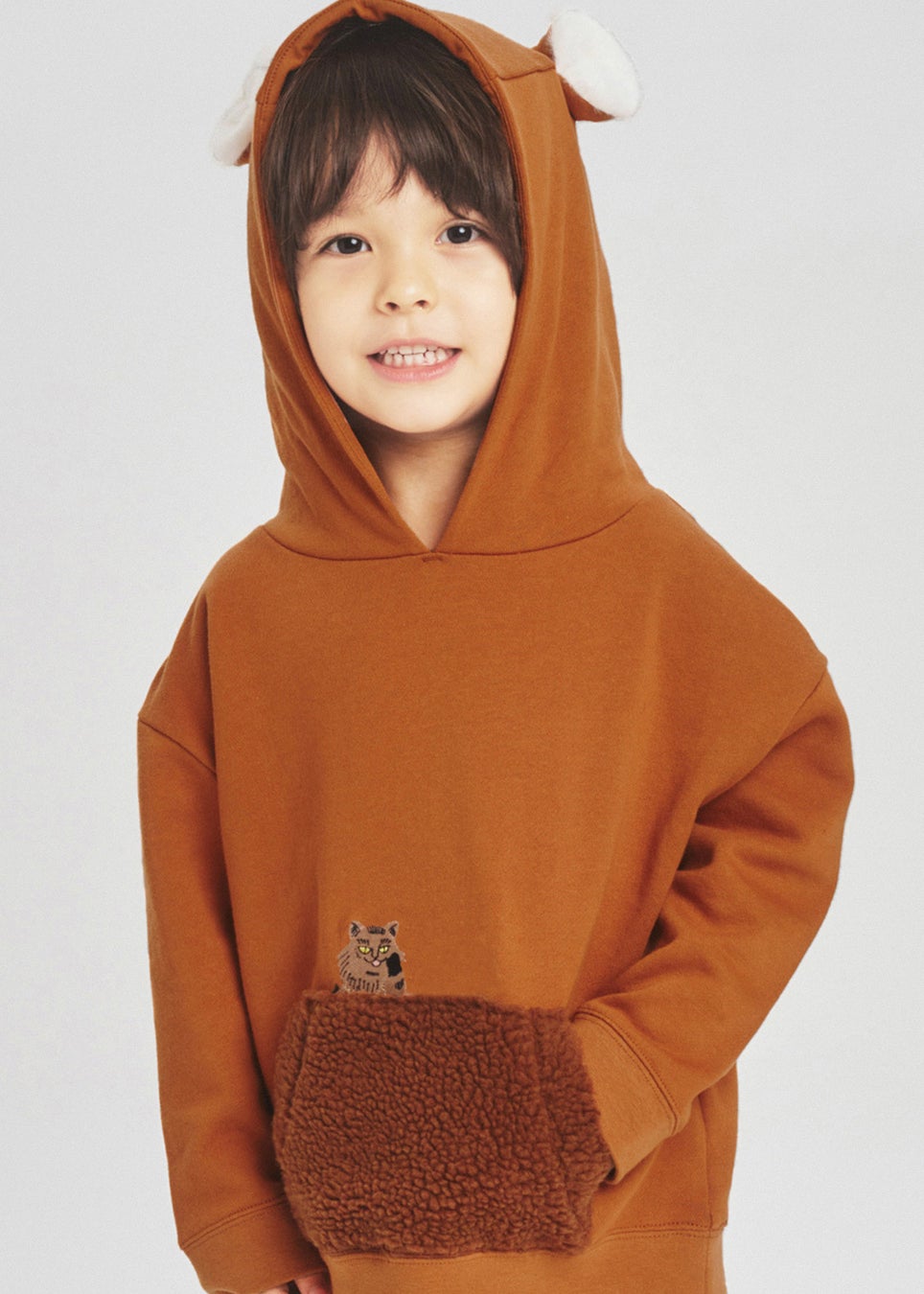 裏毛を使用したベーシックなシルエットのスウェットパーカー。カンガルーポケットとフードの耳には異なる表情のフェイクファーを使用。