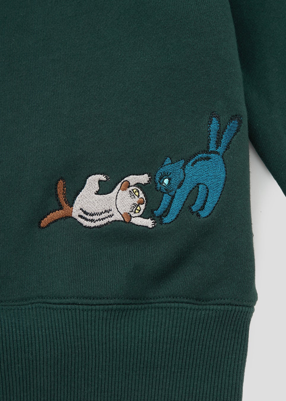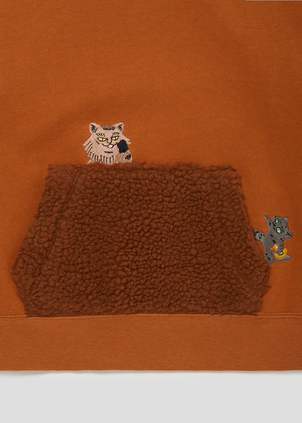 絵本『こねこのきょうだいかぞえうた おふろ』より。ポケット上のお父さん猫とおもちゃのアヒルを抱えて登っていく子猫を刺繍で表現したデザイン。耳付きフードで子猫に変身できてしまう1枚です。