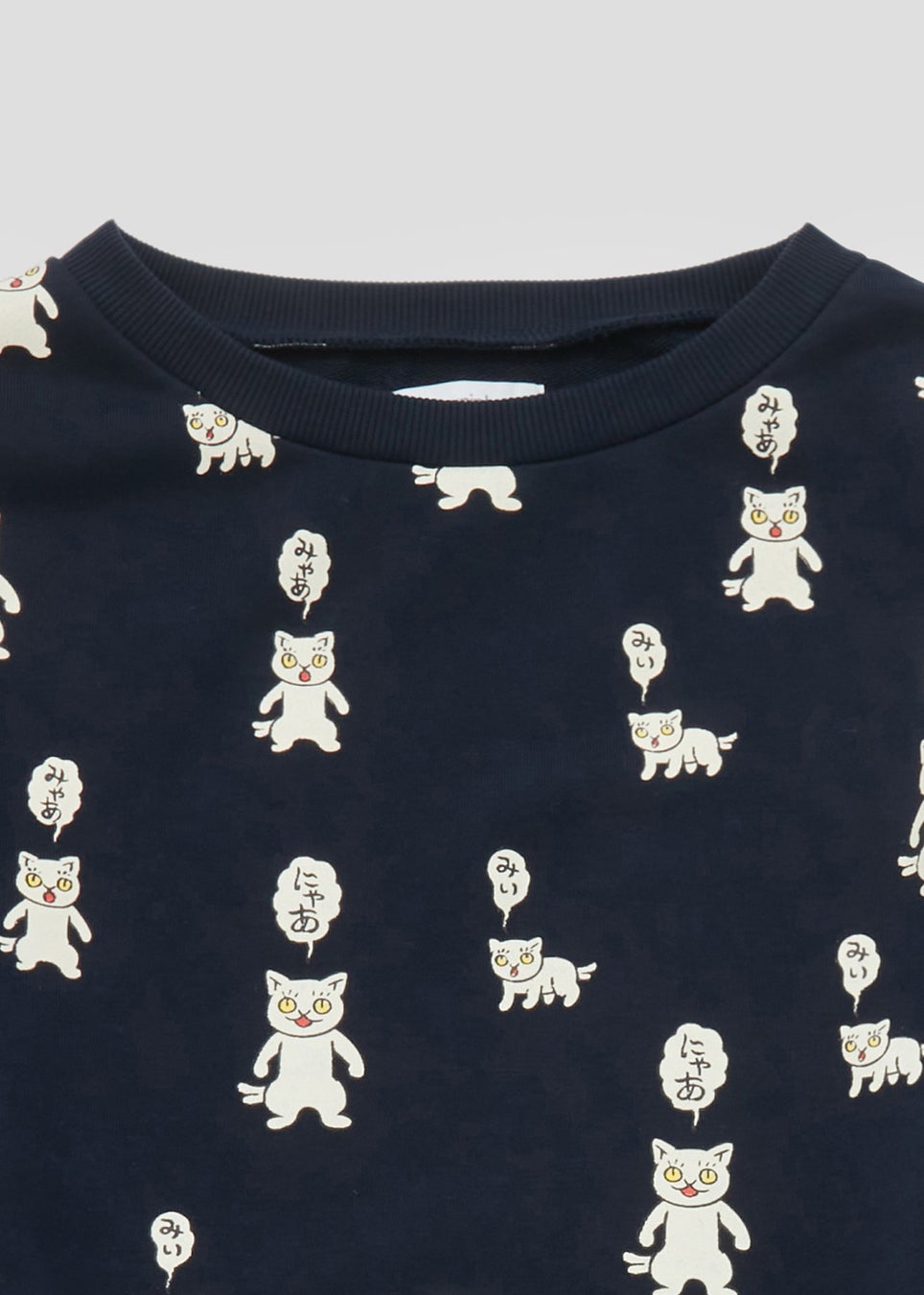 2匹の親猫と5匹の子猫たち、個性豊な猫又親子をバックプリントにしたデザイン。フロントのじゃれあう子猫2匹は刺繍で表現。