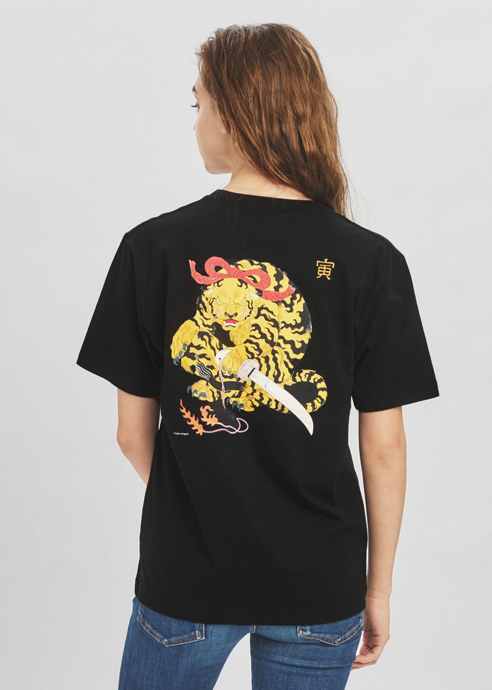 『石黒亜矢子作品集』より。干支シリーズの中から迫力のある寅を大きくバックプリントにしたインパクトあるデザイン。左胸には印象的な石黒亜矢子オリジナル落款印のプリントでワンポイントに。