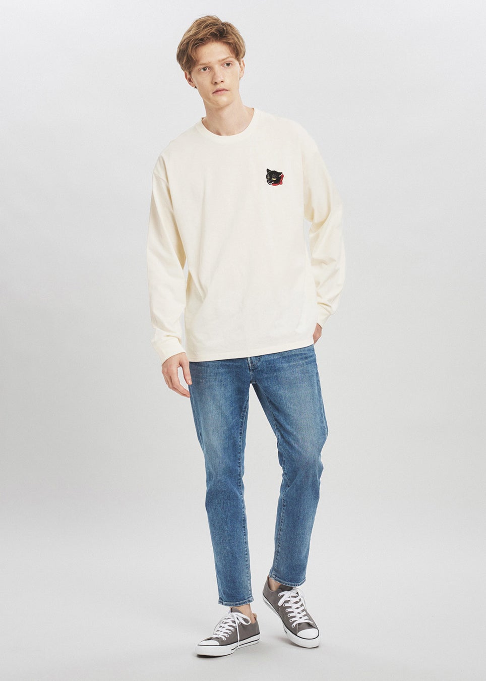 風合いの良い天竺を使用した、袖口がリブタイプの長袖Tシャツ。少しゆったりめのシルエット。
