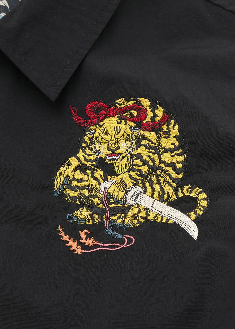 胸元に寅の文字と、干支シリーズの迫力のある寅のイラストを刺繍で表現したデザイン。緻密に描かれた十二支を全て集結させ総柄として裏地に使用した贅沢な1枚。