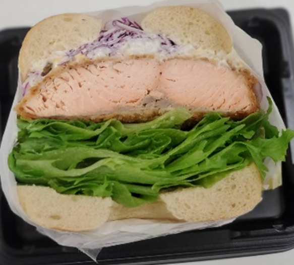 (2)商品概要:今が旬の秋鮭をフライにしました。彩り鮮やかな紫キャベツといわき産フリルレタスにタルタルソースを添えて。添付のレモンを搾ってさっぱりとおしゃれにお召し上がりください。