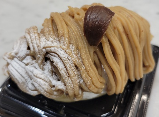 (2)商品概要:プレーンベーグルに甘栗を加えたホイップクリームをサンド。濃厚な渋皮入りマロンクリームをたっぷり絞りました。こんな形のモンブラン見たことありますか?