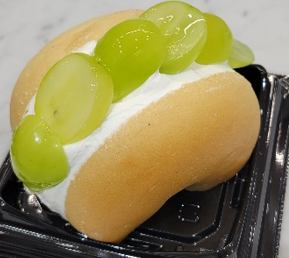 (2)商品概要:プレーンベーグルに、クリームチーズとホイップクリームをサンドし、贅沢に3粒の福島県産シャインマスカットを埋め込みました。まるで宝石のようにキラキラ輝くシャインマスカットです。