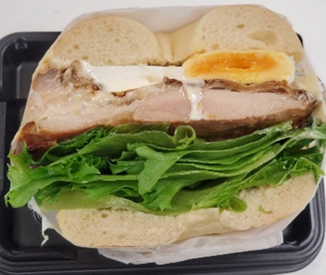 (2)商品概要:チキンステーキに目玉焼きを乗せてボリュームたっぶりの親子サンドに仕上げました。いわき産のフリルレタスもたっぷりでバランス最高です。