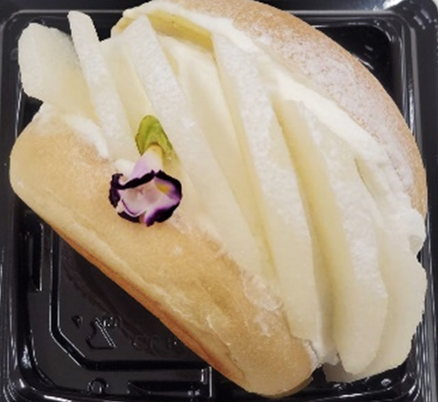 (2)商品概要:いわき産の梨とクリームチーズ、ホイップクリームのハーモニー。トッピングの梨は、つまんで上品に食べても良し、大きなお口でかぶりついてもよし。シャリシャリとふわふわの食感が新しいです。