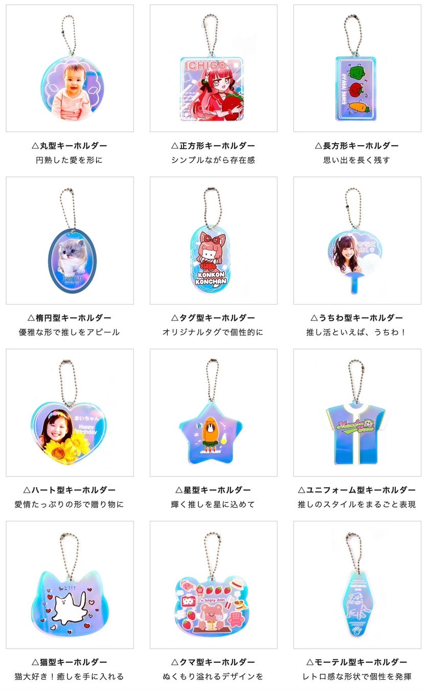 うちわ型や人気定番の丸型からモーテル型まで、さまざまな形状でオリジナルな推しキーホルダーを作成することができます。推しの魅力を形にして、日常に彩りをプラスしましょう!