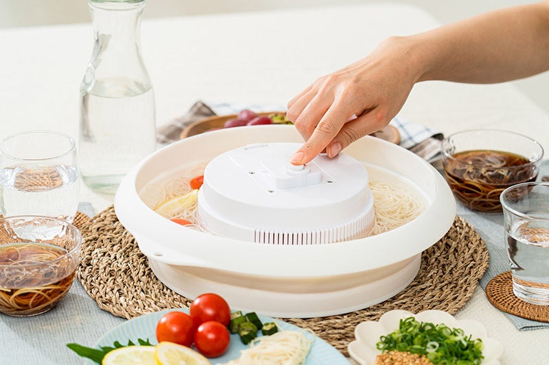 折りたためるシリコンボウルに水とそうめんを入れるタイプの流しそうめん器。