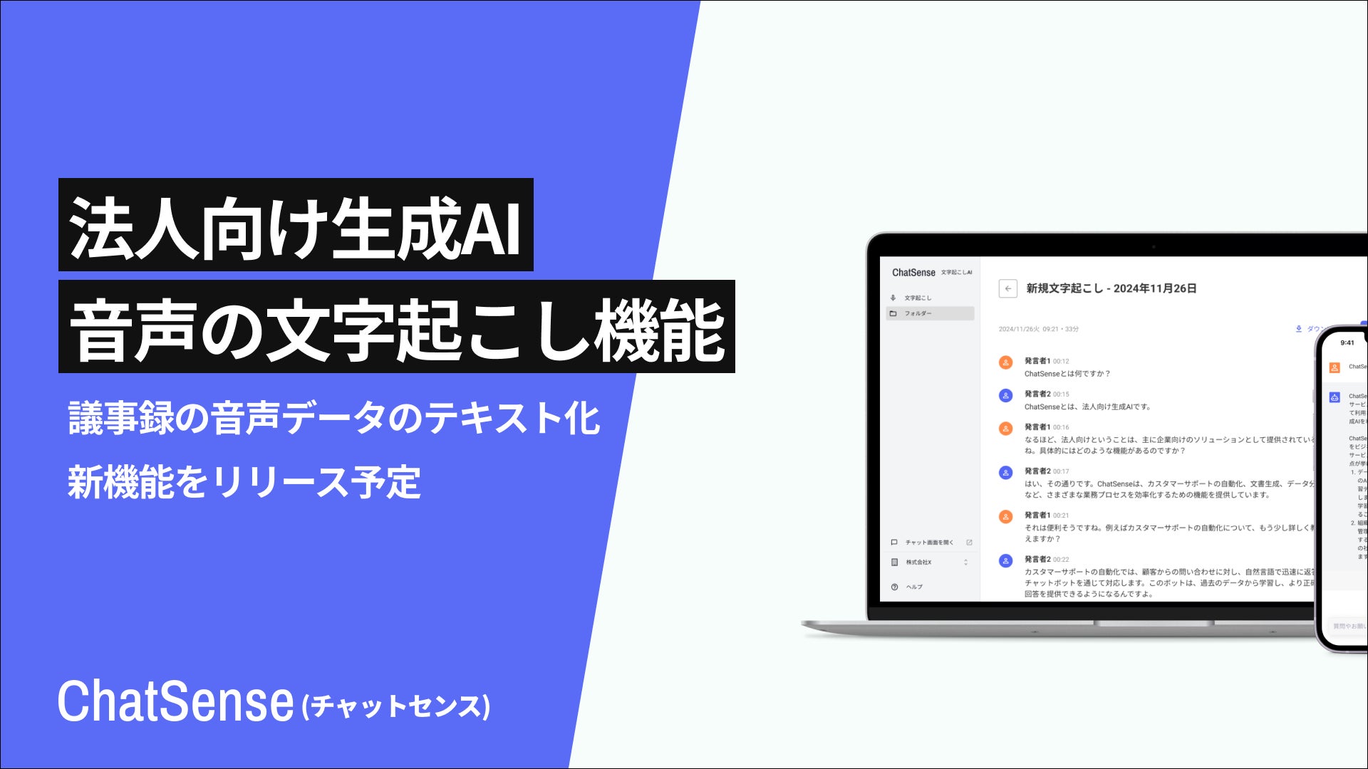 音声データをAIで文字起こしできる機能をリリース予定。法人向けChatGPTサービス「ChatSense」の新機能。