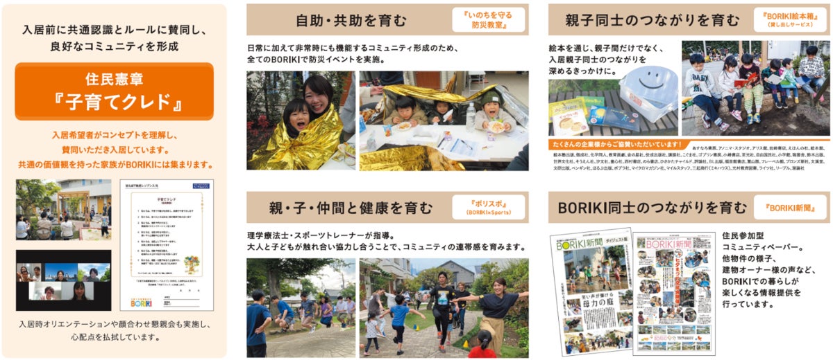 「ヘーベルメゾン BORIKI」では、BORIKIで共に暮らすための共通認識と基本ルールを記した住民憲章「子育てクレド」を制定しています。この内容に賛同いただいたご入居者のみ契約しているため、同じ価値観を持った世帯が集まります。ご入居後には、入居者と作るコミュニティ紙「BORIKI新聞」の発行や、コミュニティ醸成のための交流イベントなどを通じて、子育てコミュニティの形成を継続的にサポートしています。