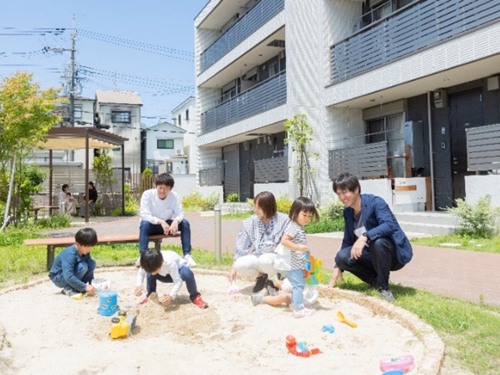 「ヘーベルメゾン BORIKI」では、入居者同士のゆるやかな繋がりをつくりだすために、共用部と各住戸における設計の工夫をしています。敷地内に中庭を設け、親が子どもを見守りながら情報交換できる見守りステーションと砂場を設置。各住戸はできる限り中庭に面する形で配置することで、自然な声かけや見守りができるよう工夫するなど、設計の工夫により入居者同士がお互いに子どもを見守り合う関係を育みます。