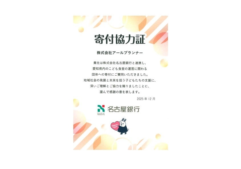 戸建住宅を中心とした住宅プラットフォーム事業を展開する株式会社アールプランナー(本社:名古屋市東区、代表取締役社長:梢 政樹、以下「当社」)は、株式会社名古屋銀行(本店:愛知県名古屋市、頭取 藤原 一朗、以下「名古屋銀行」)が取り扱う、地域の子どもたちを支援する「めいぎん地域みらいサポート定期預金」の趣旨に賛同し、2025年12月15日に5,000万円の預入れを実施したことをお知らせいたします。